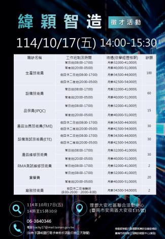 114/10/17(五)勞工局職訓就服中心辦理『緯穎智造股份有限公司』單一廠商徵才活動,歡迎求職民眾踴躍參加