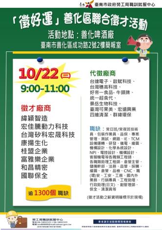 為打造黃偉哲市長「希望家園」的施政願景,勞工局積極辦理各項就業徵才活動,並因應產業求才需求,勞工局職訓就服中心將於10月22日(三) 9時00分至11時00分在善化啤酒廠 (臺南市善化區成功路2號2樓簡報室)辦理【徵好運】善化區聯合徵才活動,邀請逾18家廠商提供逾1300個職缺,歡迎求職民眾踴躍前往參加,洽詢電話:06-5892322/06-5892325。