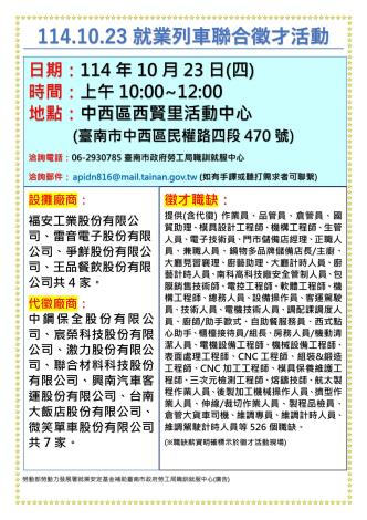 為打造黃偉哲市長「希望家園」的施政願景,勞工局積極辦理各項就業徵才活動,並因應產業求才需求,勞工局職訓就服中心將於114年10月23日(週四)上午10時至12時在中西區西賢里活動中心(臺南市中西區民權路四段470號)辦理「114.10.23就業列車聯合徵才活動」,邀請11家廠商提供526個職缺,歡迎求職民眾踴躍前往參加,洽詢電話:06-2930785。
