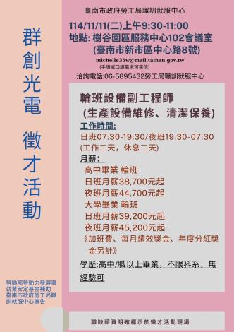 114/11/11(二)勞工局職訓就服中心辦理群創光電股份有限公司徵才活動,歡迎求職民眾踴躍參加