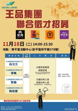 為打造黃偉哲市長「希望家園」的施政願景,勞工局積極辦理各項就業徵才活動,並因應產業求才需求,臺南市銀髮人才服務據點將於11月18日(二)下午2點至3點半舉辦王品集團聯合徵才活動,地點於育平里活動中心(臺南市安平區府平路376號),邀請4家廠商提供30個職缺,歡迎求職民眾踴躍前往參加,洽詢電話:06-5832516。