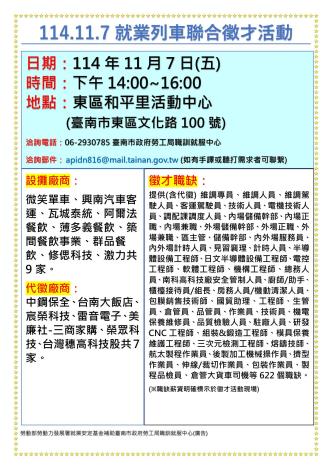 為打造黃偉哲市長「希望家園」的施政願景,勞工局積極辦理各項就業徵才活動,並因應產業求才需求,勞工局職訓就服中心將於114年11月7日(週五)下午14時至16時在東區和平里活動中心(臺南市東區文化路100號)辦理「114.11.7就業列車聯合徵才活動」,邀請16家廠商提供622個職缺,歡迎求職民眾踴躍前往參加,洽詢電話:06-2930785。