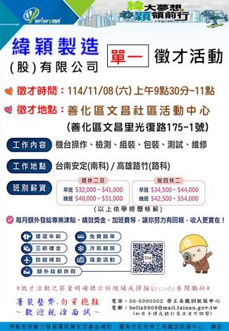 114/11/8(六)勞工局職訓就服中心辦理『緯穎智造股份有限公司』單一徵才活動,歡迎求職民眾踴躍參加
