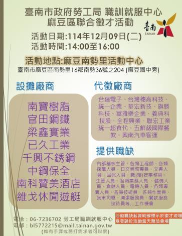 為打造黃偉哲市長「希望家園」的施政願景,勞工局積極辦理各項就業徵才活動,並因應產業求才需求,勞工局職訓就服中心將於12月09日(二)14:00至16:00時在麻豆南勢里活動中心(臺南市麻豆區南勢里16鄰南勢36號之204 /麻豆國中旁)『麻豆徵才活動』,邀請20家廠商提供678個職缺,歡迎求職民眾踴躍前往參加,洽詢電話:06-7236702
