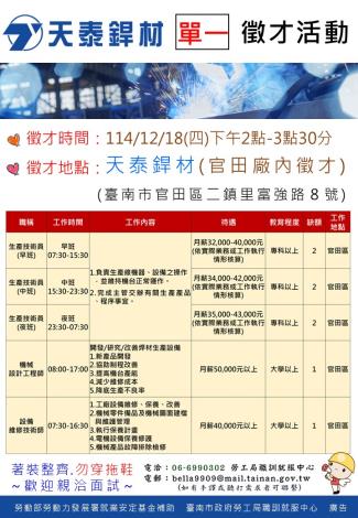 114/12/18(四)勞工局職訓就服中心辦理『天泰銲材工業股份有限公司』單一徵才活動,歡迎求職民眾踴躍參加
