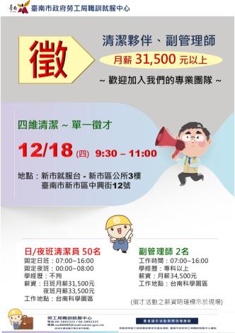 為打造黃偉哲市長「希望家園」的施政願景,勞工局積極辦理各項就業徵才活動,並因應產業求才需求,勞工局職訓就服中心將於12月18日(四)09時30分至11時00分在新市就服台(臺南市新市區中興路12號-新市區公所3樓)辦理『四維清潔有限公司』單一廠商徵才活動,提供52個職缺,歡迎求職民眾踴躍前往參加,洽詢電話:06-5892325。