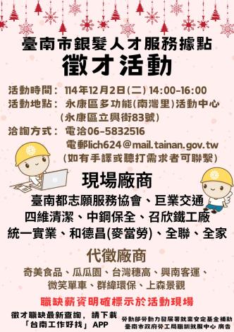 為打造黃偉哲市長「希望家園」的施政願景,勞工局積極辦理各項就業徵才活動,並因應產業求才需求,臺南市銀髮人才服務據點將於12月2日(二)下午2點至4點舉辦聯合徵才活動,地點於永康區多功能(南灣里)活動中心(臺南市永康區立興街83號),邀請16家廠商提供785個職缺,歡迎求職民眾踴躍前往參加,洽詢電話:06-5832516。