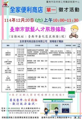 為打造黃偉哲市長「希望家園」的施政願景,勞工局積極辦理各項就業徵才活動,並因應產業求才需求,勞工局職訓就服中心將於114年12月20日(週六)上午10點至11點30分在臺南市銀髮人才服務據點(善化區民族路1號) 辦理『全家便利商店股份有限公司』單一徵才活動,提供70個工作機會,歡迎求職民眾踴躍前往參加,洽詢電話:06-6990370。