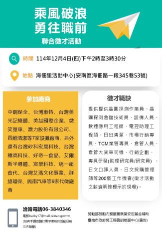 為打造黃偉哲市長「希望家園」的施政願景,勞工局積極辦理各項就業徵才活動,並因應產業求才需求,勞工局職訓就服中心將於12月4日(四)下午2時至3時30分在海佃里活動中心(安南區海佃路一段345巷53號)辦理乘風破浪勇往職前聯合徵才活動,邀請16家廠商提供200個職缺,歡迎求職民眾踴躍前往參加,洽詢電話:06-3840346。