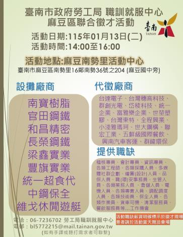 115/01/13(二)勞工局職訓就服中心辦理「麻豆區聯合徵才活動」歡迎求職民眾踴躍參加
