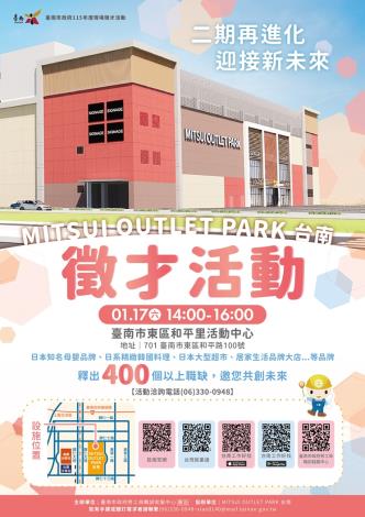 115/01/17(六)勞工局職訓就服中心辦理『MITSUI OUTLET PARK台南』二期店舖聯合徵才活動,歡迎求職民眾踴躍參加