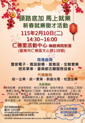 115/02/10(二)勞工局職訓就服中心辦理『頭路底加 馬上就業』新春就業徵才活動,歡迎求職民眾踴躍參加