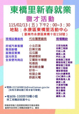 115/02/13(五)勞工局職訓就服中心辦理永康區東橋里活動中心新春就業徵才活動 歡迎求職民眾踴躍參加