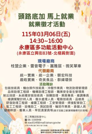 為打造黃偉哲市長「希望家園」的施政願景,勞工局積極辦理各項就業徵才活動,並因應產業求才需求,勞工局職訓就服中心將於03月06日(五)14時30分至16時在永康區多功能活動中心(臺南市永康區立興街83號)辦理『頭路底加 馬上就業』就業徵才活動,邀請10家廠商提供90個職缺,歡迎求職民眾踴躍前往參加,洽詢電話:06-3300948。