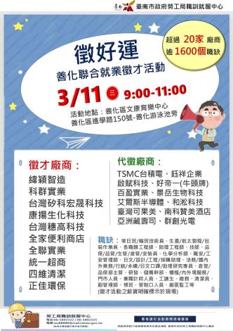 115/03/11(三)勞工局職訓就服中心辦理【徵好運】善化區聯合徵才活動,歡迎求職民眾踴躍參加