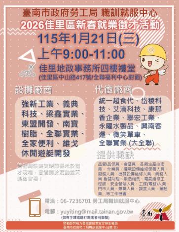 為打造黃偉哲市長「希望家園」的施政願景,勞工局積極辦理各項就業徵才活動,並因應產業求才需求,勞工局職訓就服中心將於115年1月21日(三)上午9至11時在佳里地政事務所四樓禮堂(佳里區中山路417號/全聯福利中心對面)辦理「2026佳里區新春就業徵才活動」,邀請17家廠商提供282個職缺,歡迎求職民眾踴躍前往參加,洽詢電話:06-7236701。