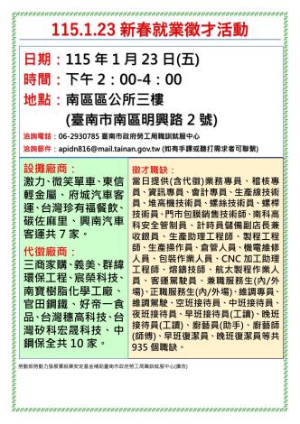 為打造黃偉哲市長「希望家園」的施政願景,勞工局積極辦理各項就業徵才活動,並因應產業求才需求,勞工局職訓就服中心將於115年1月23日(週五)下午2時至4時在南區區公所三樓(臺南市南區明興路2號)辦理「115.1.23新春就業徵才活動」,邀請17廠商提供935個職缺,歡迎求職民眾踴躍前往參加,洽詢電話:06-2930785。