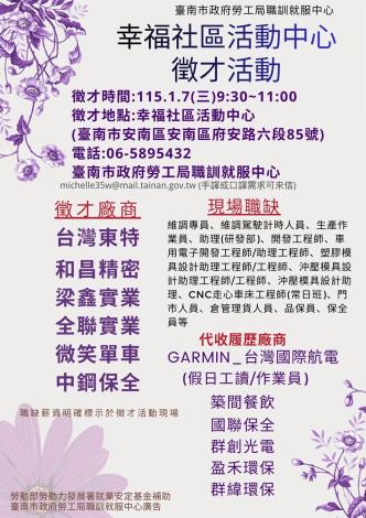 為打造黃偉哲市長「希望家園」的施政願景,勞工局積極辦理各項就業徵才活動,並因應產業求才需求,勞工局職訓就服中心將於1月7日(週三)上午9點30分至11點在幸福社區活動中心辦理小型徵才活動(臺南市安南區府安路六段85號),共邀請12家廠商提供超過400個職缺,歡迎求職民眾踴躍前往參加,洽詢電話:06-5895432。
