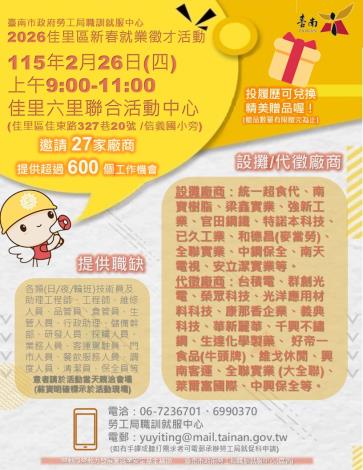115/2/26(四) 2026佳里區新春就業徵才活動,歡迎求職民眾踴躍參加