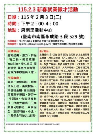 為打造黃偉哲市長「希望家園」的施政願景,勞工局積極辦理各項就業徵才活動,並因應產業求才需求,勞工局職訓就服中心將於115年2月3日(週二)下午2時至4時在府南里活動中心(臺南市南區永成路3段529號)辦理「115.2.3新春就業徵才活動」,邀請22廠商提供821個職缺,歡迎求職民眾踴躍前往參加,洽詢電話:06-2930785。
