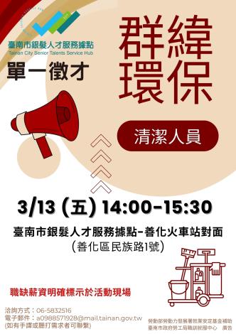 為打造黃偉哲市長「希望家園」的施政願景,勞工局積極辦理各項就業徵才活動,並因應產業求才需求,臺南市銀髮人才服務據點將於3月13日(五)下午2時至3時30分舉辦群緯環保工程有限公司單一徵才活動,地點於臺南市銀髮人才服務據點(臺南市善化區民族路1號),提供30個職缺,歡迎求職民眾踴躍前往參加,洽詢電話:06-5832516。