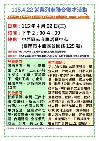 為打造黃偉哲市長「希望家園」的施政願景,勞工局積極辦理各項就業徵才活動,並因應產業求才需求,勞工局職訓就服中心將於115年4月22日(週三)下午2時至4時在中西區赤嵌里活動中心(臺南市中西區公園路125號)辦理「115.4.22就業列車聯合徵才活動」,邀請22家廠商提供1121個職缺,歡迎求職民眾踴躍前往參加,洽詢電話:06-2930785。