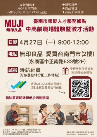 為打造黃偉哲市長「希望家園」的施政願景,勞工局積極辦理各項就業徵才活動,並因應產業求才需求,臺南市銀髮人才服務據點將於4月27日 (一)9時至12時舉辦無印良品單一徵才暨職場體驗活動,地點於無印良品-愛買台南門市2樓(臺南市永康區中正南路533號2F),提供20個職缺,讓求職者至企業了解職場環境、職務內容與工作體驗實作,並安排現場面試媒合就業,提供企業與求職者面對面徵才管道,歡迎55歲以上有求職意願者、已退休欲二度就業者踴躍報名參加(https://reurl.cc/Wb4yKy),洽詢電話:06-5832516。