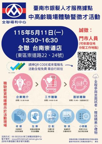 為打造黃偉哲市長「希望家園」的施政願景,勞工局積極辦理各項就業徵才活動,並因應產業求才需求,臺南市銀髮人才服務據點將於5月11日 (星期一)13時30分至16時30分舉辦全聯單一徵才暨職場體驗活動,地點於全聯台南崇道店(臺南市東區崇道路22、24號),提供30個職缺,讓求職者至企業了解職場環境、職務內容與工作體驗實作,並安排現場面試媒合就業,提供企業與求職者面對面徵才管道,歡迎55歲以上有求職意願者、已退休欲二度就業者踴躍報名參加(https://reurl.cc/ep3qqQ),洽詢電話:06-5832516。