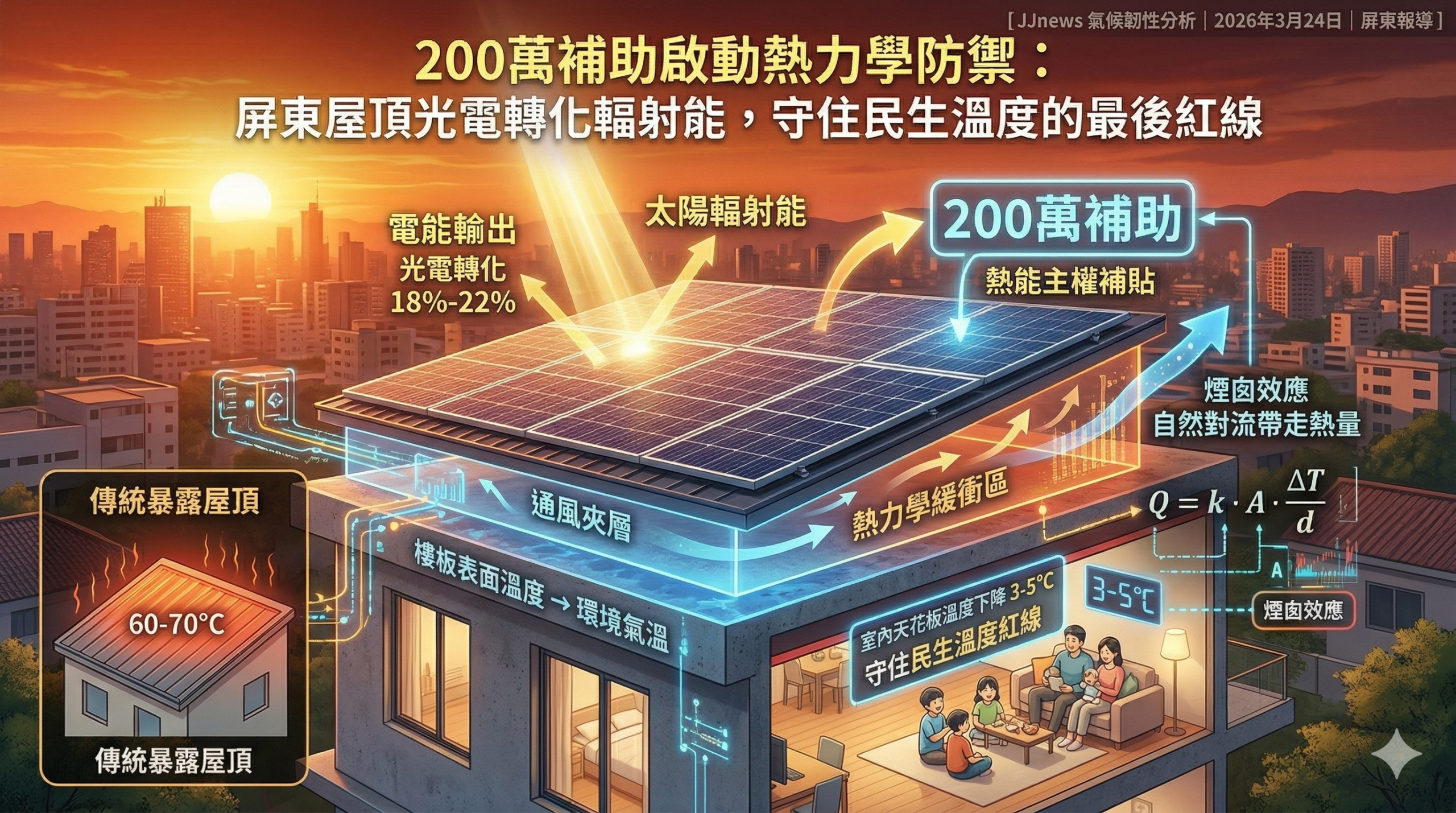 在 2026 年極端高溫頻次倍增的背景下,熱能管理已從單純的舒適度議題提升至生物生存等級。屏東縣政府近期推動的屋頂光電補助政策,其核心物理意義在於透過輻射屏蔽,實質削減建築物的熱載荷。這項政策不僅是一場能源生產的轉型,更是一場針對都市微氣候與個體居住環境的熱力學防禦。透過將太陽輻射能轉化為電能而非熱能,光電系統正重新定義建築物與生物體在高溫環境下的共生模式。