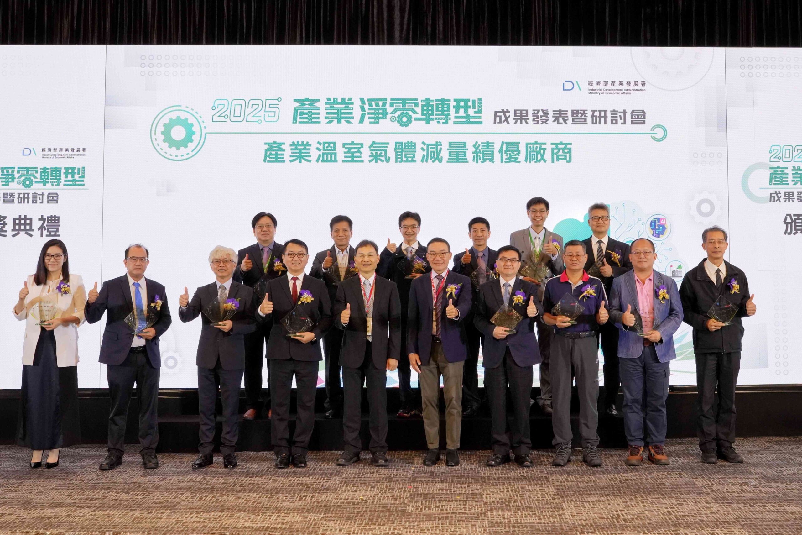 為務實協助產業解決轉型所面臨的挑戰,產業發展署結合全國工業總會、相關產業公協會成立產業別淨零工作小組,除共同研議及推動產業溫室氣體減量措施,並從中選出14家溫室氣體減量績優廠商藉本次活動表揚,不僅肯定廠商在溫室氣體減量的努力與貢獻,更藉此機會,向產業界加強宣導與推展自願性減碳成果,為產業樹立低碳典範。同時,為呼應政府推動資源循環與綠色產品政策,活動中亦依據經濟部「資源再生綠色產品審查認定辦法」,授證予通過資源再生綠色產品申請的14家廠商,及特別表揚採購資源再生綠色產品前3名企業,以鼓勵產業落實綠色採購。