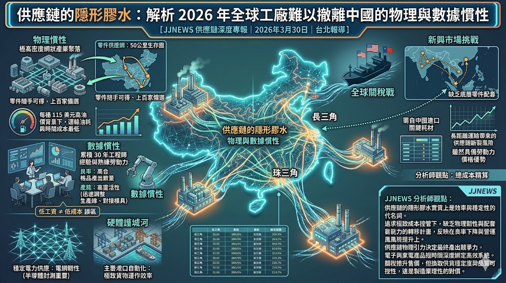 在全球關稅戰屆滿 1 週年的 2026 年,儘管外部貿易阻力持續攀升,多數製造業龍頭並未如預期般全面撤出中國。這背後並非單純的市場留戀,而是一層由極其現實的物理佈局與生產數據交織而成的隱形膠水。搬遷一座工廠的硬體設備相對容易,但要整體遷移深耕數十年的產業聚落,在當前的全球經濟環境下幾乎是物理層面的不可能任務。
