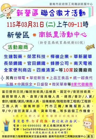 3/31(二)勞工局職訓就服中心辦理2026「新營區」聯合徵才活動, 歡迎求職民眾踴躍參加