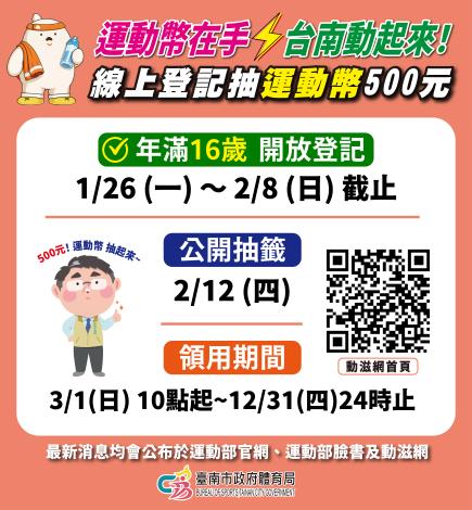 運動部115年推出「運動幣」,並採登記抽籤方式辦理。凡年滿16歲(民國99年1月1日前出生)且設籍國內之國民,均可於115年1月26日上午10時起至2月8日24時止完成登記,並將於115年2月12日辦理公開抽籤,有機會獲得500運動幣,歡迎市民把握機會踴躍參與。