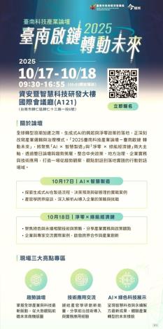 論壇將於10月17日(五)及10月18(六)的上午9時30分至下午16時55分舉行,地點為資安暨智慧科技研發大樓國際會議廳A121(臺南市歸仁區歸仁十三路一段6號),報名連結如下:https://events.businesstoday.com.tw/2025/TainanTechnology/,誠摯邀請產業界、學界、公協會與市民朋友踴躍參加,攜手見證AI與科技如何引領臺南產業邁向新世代。
