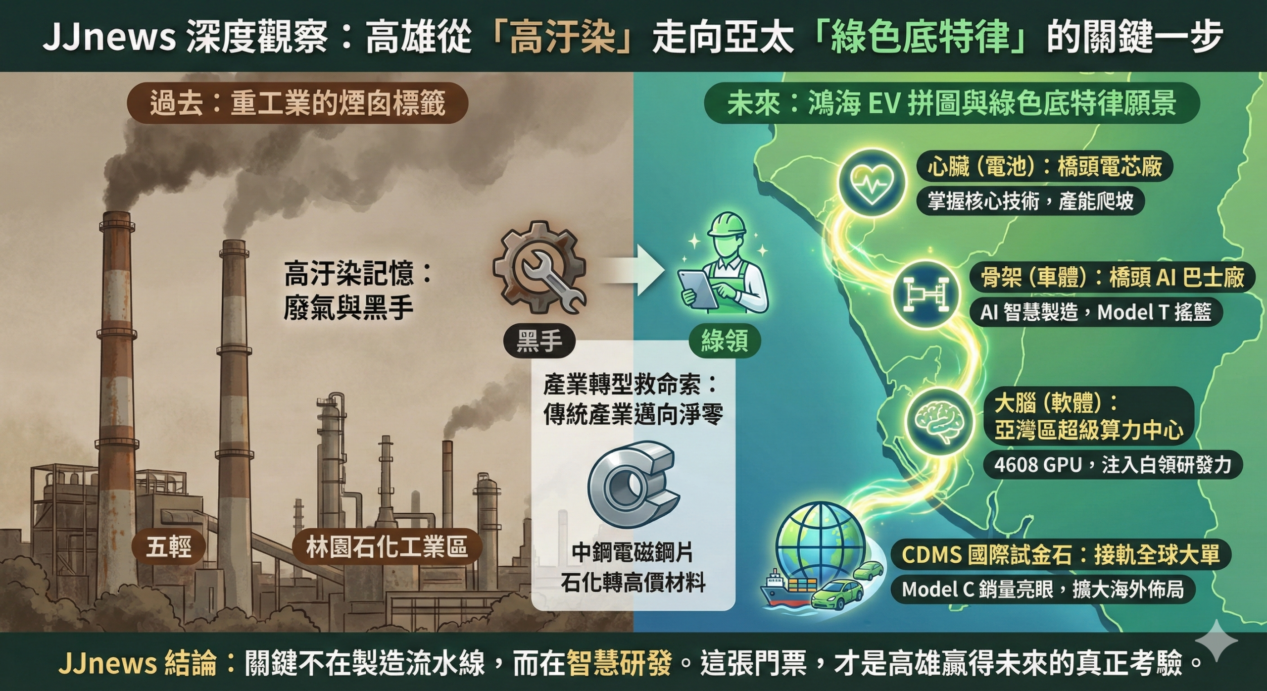 高雄人吸了半個世紀的廢氣,從楠梓的五輕到林園的石化工業區,城市的經濟成長始終與煙囪緊密相連。然而,當鴻海董事長劉揚偉喊出「3+3 轉型策略」時,2026 年的高雄正親身經歷一場前所未有的工業 DNA 突變。隨著 Model T 電動巴士安靜滑過博愛路,這座曾經的重工業之都,正試圖撕掉「高汙染」標籤,轉身跨入亞太「綠色底特律」的新紀元。